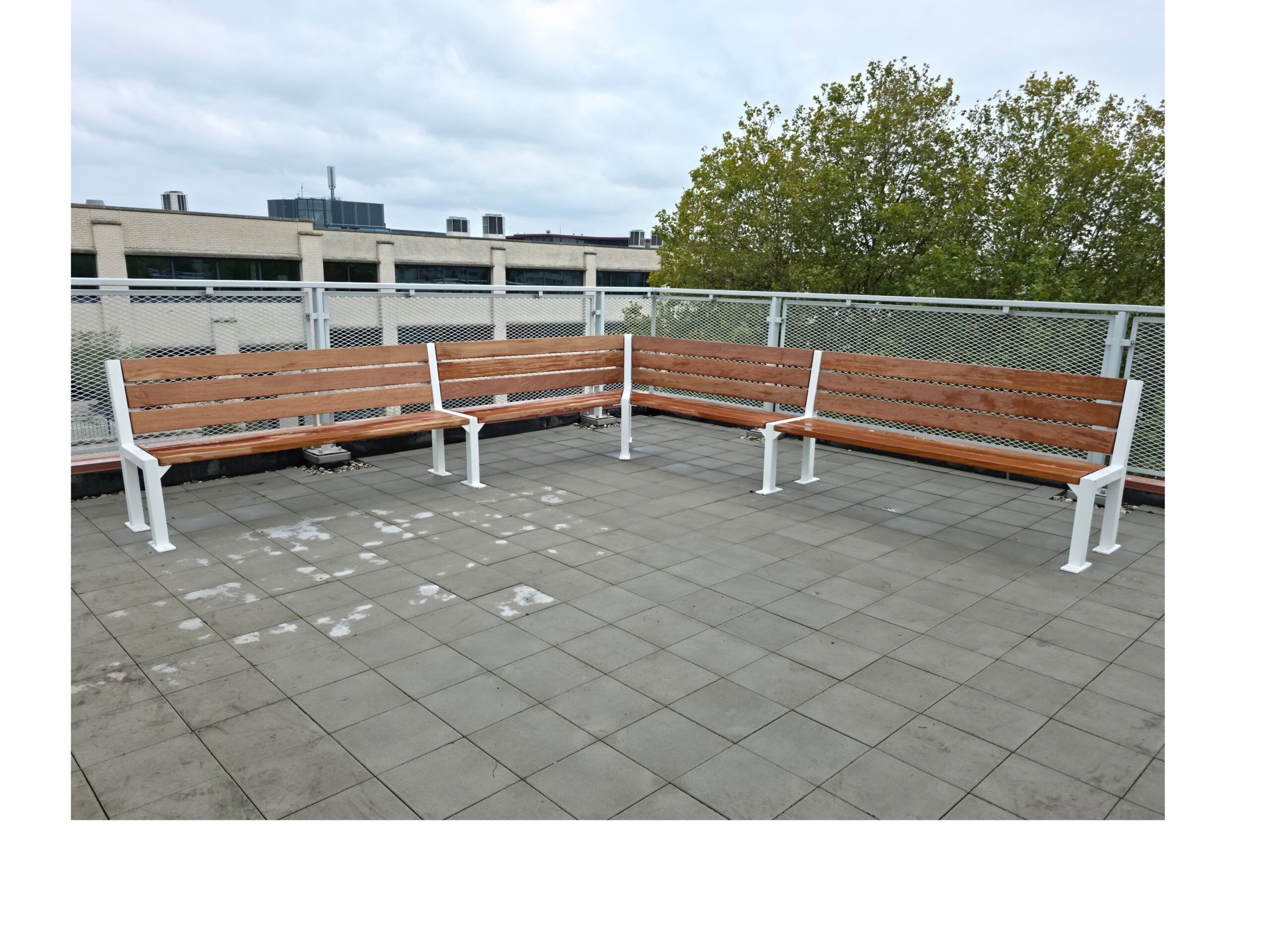 De banken en tafels bestaan uit thermisch verzinkte stalen staanders met daartussen hardhouten liggers.