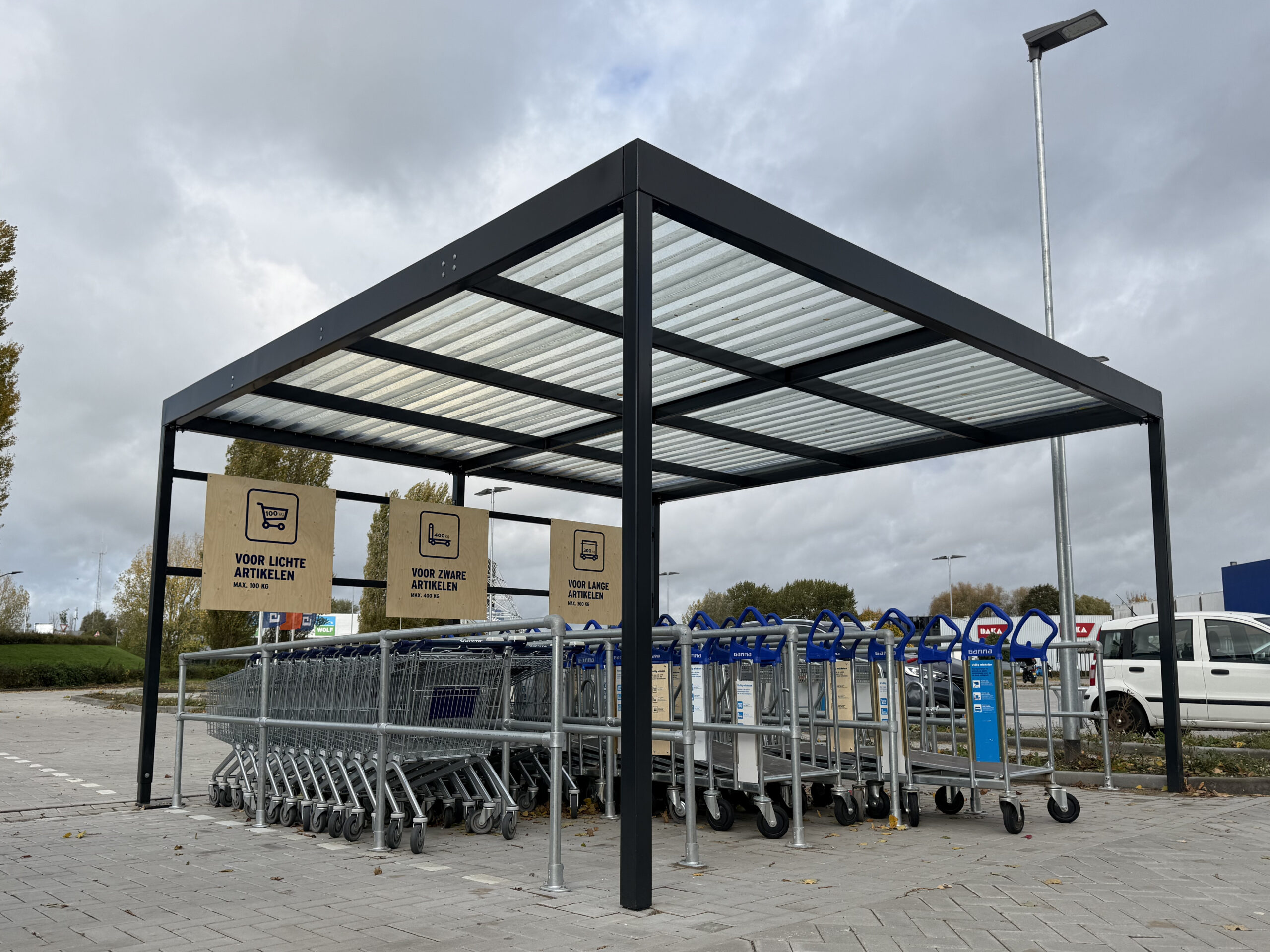 Om winkelwagens te plaatsen levert Metec een karopvang. Ook het bijbehorende buiskoppelsysteem wordt door Metec geleverd en gemonteerd.